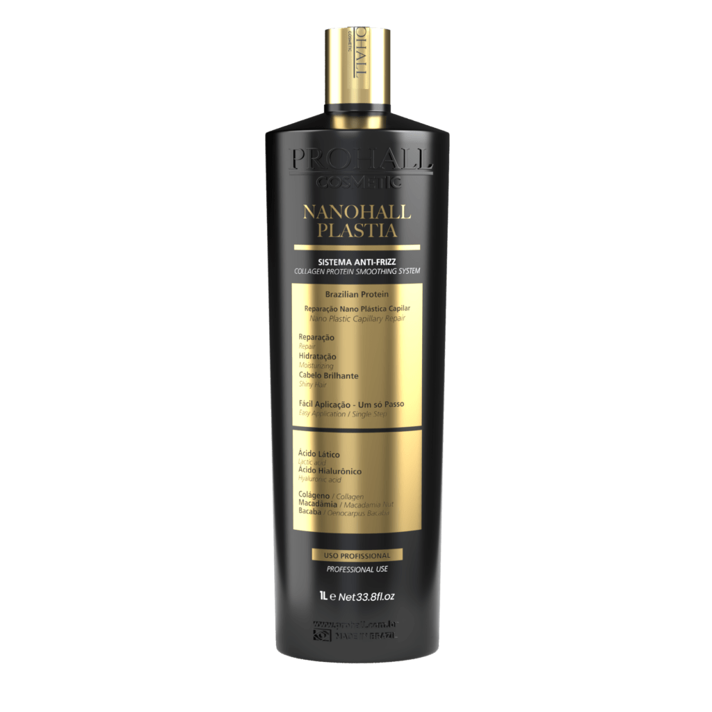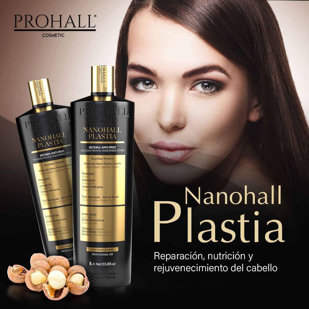 Nanohall Plastia é o novo alisamento da Prohall, com reparo capilar Nanoplástico. Oferece aos cabelos um realinhamento molecular saudável e duradouro. A sua tecnologia é enriquecida com ingredientes naturais e tecnológicos responsáveis ​​por renovar a fibra capilar danificada e recuperar a força perdida pelos cabelos. Com a sua ação hidratante e preenchedora, Nanohall Plastia protege a fibra capilar e evita que as cutículas se abram, retendo o tratamento no interior do cabelo.